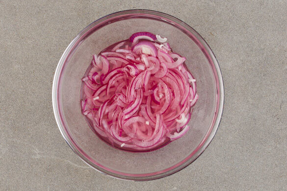 1EL Zucker, 1TL Salz und 80ml Essig verrühren, bis sich Salz und Zucker auflösen. Die restlichen Zwiebeln untermengen und beiseitestellen.