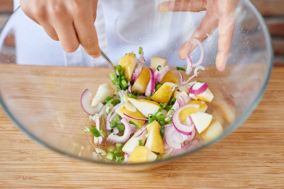 Inzwischen Enden der Lauchzwiebel entfernen, dann in feine Ringe schneiden. Kerngehäuse der Birne entfernen, ca. 1cm groß würfeln. Zwiebel schälen, in feine Streifen schneiden. Alles in großer Schüssel mit 1EL Essig vermengen, salzen, pfeffern und ziehen lassen.