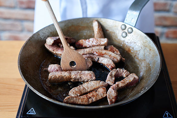 Fleisch waschen, trocken tupfen und in fingerdicke Streifen schneiden. Pfanne mit 2EL Öl stark erhitzen und das Fleisch ca. 3-5Min. bis zum gewünschten Garpunkt anbraten. Mit Salz würzen und einige Minuten ruhen lassen.