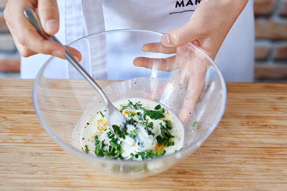 Orange waschen, trocken reiben, dann Schale abraspeln und Saft auspressen. Minze hacken. Joghurt mit 1TL Orangenschale sowie 1EL Orangensaft, Hälfte der Minze und Salz, Pfeffer abschmecken.