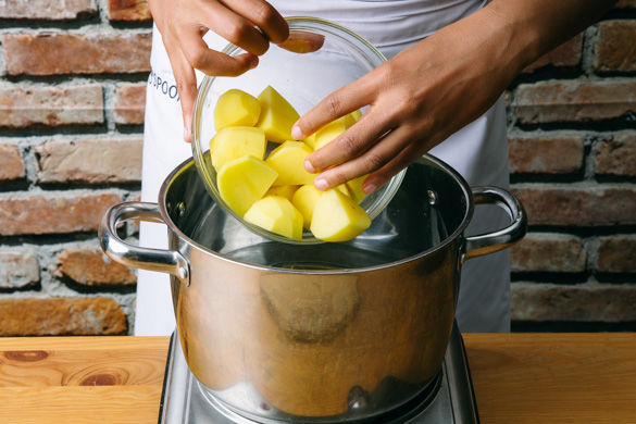 Die Kartoffeln nach Wunsch schälen und vierteln. Sobald das Wasser kocht, die Kartoffeln für ca 20-25Min. gar kochen, dann abgießen und gut abtropfen lassen.