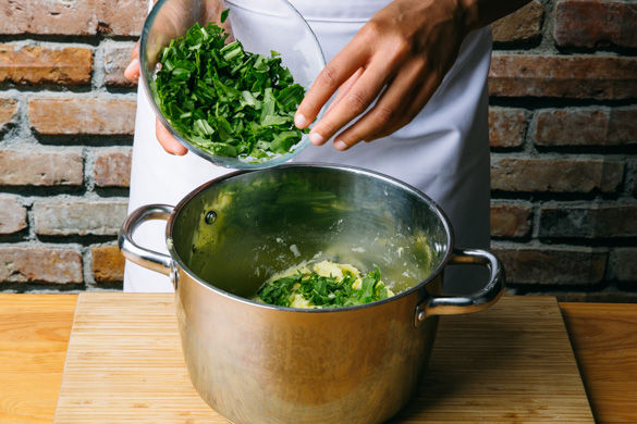 In der Zwischenzeit den Rucola grob schneiden. Die abgetropften Kartoffeln mit 2-3EL Olivenöl fein stampfen, mit Salz abschmecken und den Rucola untermischen. Den Fisch mit Kartoffelstampf servieren.