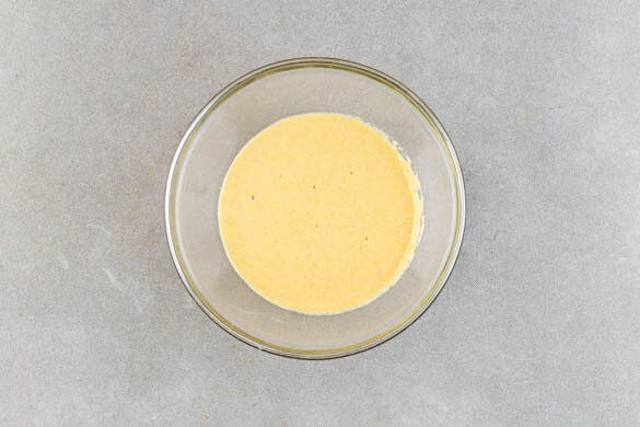 100g Kichererbsenmehl mit 1 Ei, 200ml warmem Wasser und ½TL Salz verquirlen und beiseitestellen. Tipp: Der Teig wird mit warmem Wasser geschmeidiger.