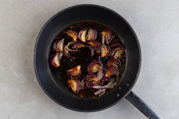 Die Zwiebel schälen, halbieren und in ca. 0,5cm dicke Spalten schneiden. Die Zwiebelspalten in einer großen Pfanne mit 1EL Butter und 1 Prise Salz bei mittlerer Hitze ca. 10Min. weich und goldbraun braten, dabei gelegentlich umrühren. Mit 1EL Balsamicoessig ablöschen, gründlich umrühren und 2–5Min. einköcheln lassen. Die Zwiebeln herausnehmen und beiseitestellen, die Pfanne auswischen.