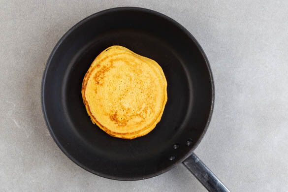 In derselben Pfanne ½TL Butter bei mittlerer bis starker Hitze schmelzen lassen. Dann die ½ des Teiges zugießen, dabei die Pfanne leicht schwenken, um den Teig gleichmäßig zu verteilen. Den Teig 2–3Min. von beiden Seiten zu einem goldbraunen Pfannkuchen ausbacken. Den Vorgang mit dem restlichen Teig wiederholen.