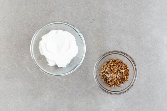 Die Sonnenblumenkerne in einer zweiten großen Pfanne mit 2TL Butter bei mittlerer bis starker Hitze in 3–5Min. goldbraun anrösten. Vorsicht, sie können schnell zu dunkel werden. Zum Abkühlen aus der Pfanne nehmen, mit 1 Prise Salz bestreuen und beiseitestellen. Den Ziegenfrischkäse mit 4EL Wasser verrühren, bis er eine streichfähige Konsistenz hat.