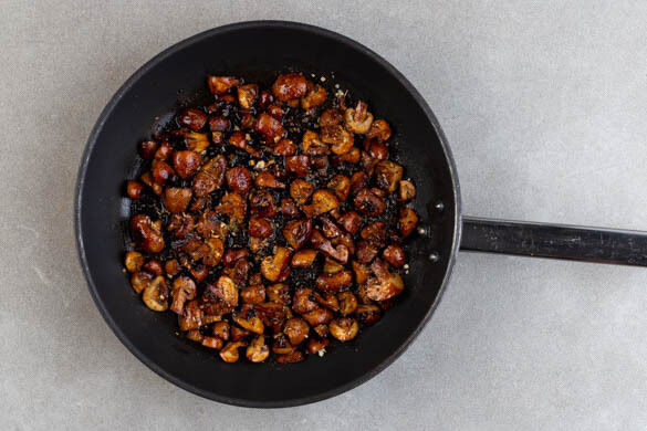 Die Pilze ggf. säubern und vierteln, dann in der ersten großen Pfanne mit 2EL Butter bei mittlerer bis starker Hitze in 5–7Min. goldbraun braten. Den Knoblauch schälen, fein würfeln, mit der Gewürzmischung in die Pfanne rühren und ca. 2Min. mitbraten. Die Pilze mit 2EL Balsmicoessig ablöschen, umrühren und mit Salz und Pfeffer abschmecken.