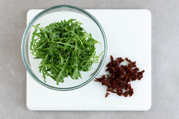 Die getrockneten Tomaten grob schneiden. Den Rucola mit 2TL Olivenöl und 1 kräftigen Prise Salz vermengen. Die Pfannkuchen mit dem Ziegenfrischkäse bestreichen, dann mit den Zwiebeln, den Pilzen, den getrockneten Tomaten und etwas Rucola belegen. Mit den Sonnenblumenkernen bestreuen und mit ggf. übrigem Rucola servieren.