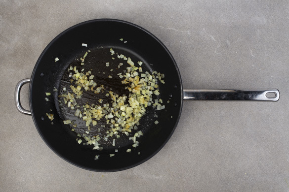 Die Zwiebel schälen, halbieren und in feine Würfel schneiden. 1EL Butter in einer großen Pfanne bei mittlerer Hitze schmelzen, dann die Zwiebeln 1–2Min. glasig anschwitzen. Die Pfanne beiseitestellen und die Zwiebeln abkühlen lassen.