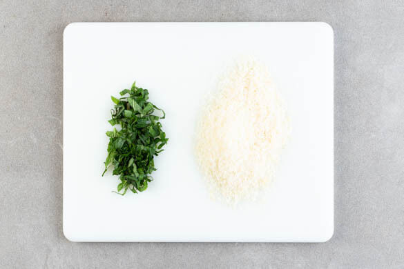 Die Basilikumblätter von den Stängeln zupfen und fein schneiden. Den Käse fein reiben.