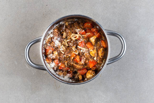 Das Fleisch untermengen und 3–5Min. mitköcheln, bis die Tomaten weich sind. Mit Salz und Pfeffer abschmecken.