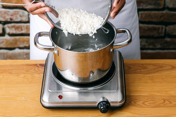400ml leicht gesalzenes Wasser im Topf zum Kochen bringen. 200g Reis in einem Sieb unter fließendem Wasser abspülen, bis das Wasser klar bleibt. Sobald das Wasser kocht, Reis bei niedrigster Hitze mit einem Deckel zugedeckt ca. 10-12Min. bissfest kochen, bis das Wasser komplett aufgesogen ist. Schließlich ca. 5Min. ohne Hitze, aber zugdeckt ziehen lassen.