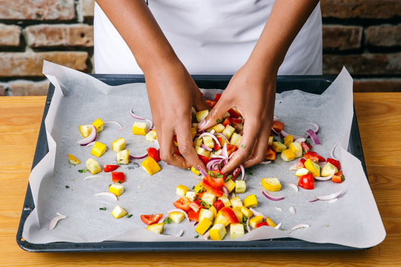 Das Gemüse samt der Zwiebel auf einem mit Backpapier ausgelegten Backblech mit dem gehackten Oregano, Salz, Pfeffer und 1-2EL Olivenöl mischen. Dann für ca. 15-20Min. im Ofen rösten, bis das Gemüse gar und goldgelb ist. Zur Mitte der Backzeit einmal durchmischen.