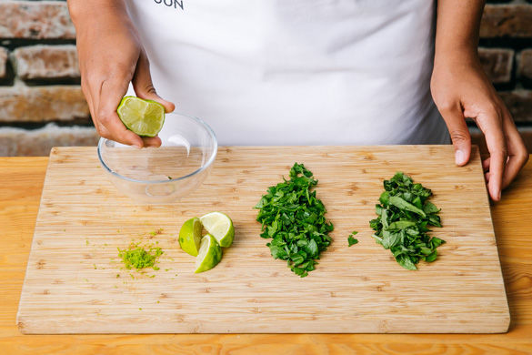 Inzwischen die Petersilie und Basilikum von den Stängeln streifen und in feine Streifen schneiden. Die Schale der Limette abreiben, eine Hälfte entsaften, die zweite in Spalten schneiden.