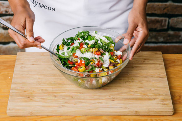 Sobald der Reis und das Gemüse gar sind, beides mit dem Rucolasalat, 1TL Limettenabrieb, Limettensaft, Käse und den restlichen Kräutern sowie dem Dressing mischen und mit Limettenspalten servieren.