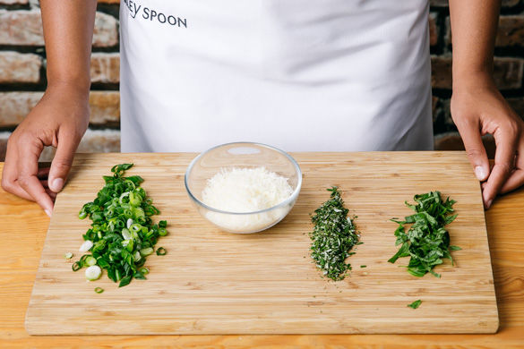 Den Umluftofen auf 180°C vorheizen. 1L Wasser im Wasserkocher kochen. Die Lauchzwiebeln in feine Röllchen schneiden. Den Käse fein reiben. Die Rosmarinblätter grob von den Stängeln streifen und fein hacken, die Basilikumblätter ebenfalls abzupfen und grob in Streifen schneiden.