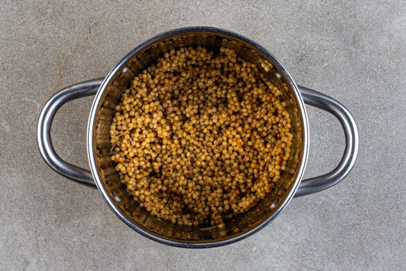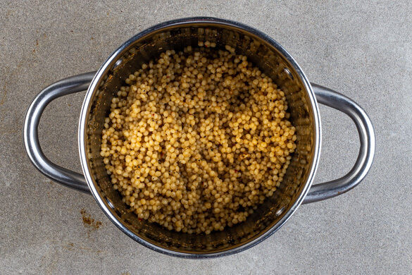 Den Perlencouscous in das kochende Wasser rühren und abgedeckt bei mittlerer Hitze 8–10Min. sanft köcheln lassen, bis das Wasser aufgesaugt und der Perlencouscous gar ist.