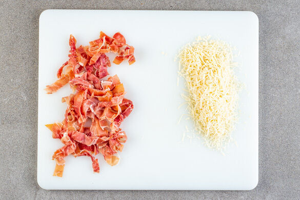 In der Zwischenzeit den Käse fein reiben. Den Schinken in feine Streifen schneiden.