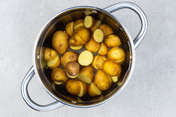 Große Kartoffeln ggf. halbieren, dann die Kartoffeln in einem großen Topf mit dem kochenden Wasser übergießen, salzen und bei starker Hitze 10–15Min. kochen, bis die Kartoffeln gar sind. In ein Sieb abgießen und abtropfen lassen.