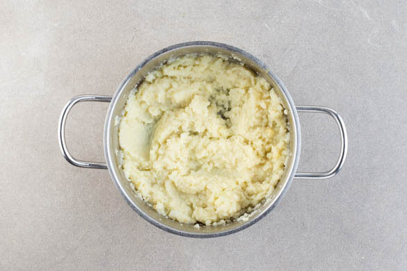 In einem großen Topf ca. 2L gesalzenes Wasser zum Kochen bringen. Den Blumenkohl in Stücke schneiden, in das kochende Wasser geben und ca. 15min. köcheln lassen, bis der Blumenkohl weich ist. Mit einer Tasse etwas Kochwasser abschöpfen, dann in ein Sieb abgießen, abtropfen lassen und zurück in den Topf geben.