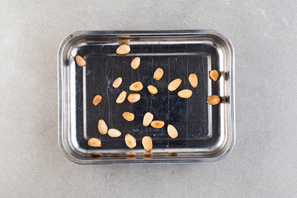 Die Mandeln in einer zweiten Auflaufform oder auf einem Backblech verteilen und 5–8Min. im Ofen rösten, bis sie beginnen, zu bräunen. Auf einem Teller abkühlen lassen.