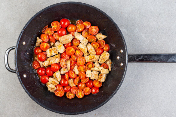 Das Fleisch in der Pfanne bei starker Hitze 2–3Min. scharf anbraten. Nach Belieben erneut mit Salz und Pfeffer würzen, dann die Tomaten dazugeben und 1–2Min. bei mittlerer Hitze mitbraten.