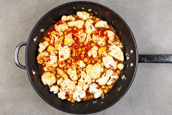 Das Tomatenmark in die Pfanne rühren, dann das Gemüse mit 200ml Wasser ablöschen und nach Belieben mit mehr Gewürzpaste sowie Salz und Pfeffer würzen. Das Curry zum Kochen bringen und 12–14Min. köcheln lassen, dabei gelegentlich umrühren.