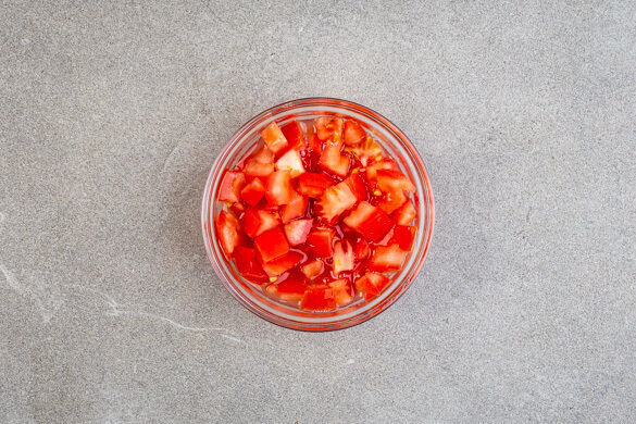 Die Limetten halbieren und auspressen. Die Tomaten in kleine Würfel schneiden, mit 2–3EL Limettensaft vermengen und mit Salz und Pfeffer abschmecken.