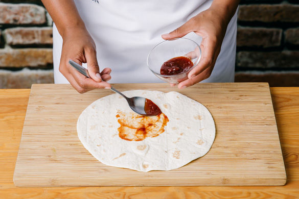 Die warmen Tortillas nach Geschmack mit der BBQ-Sauce bestreichen, den Salat darauf verteilen und mit Halloumi und Avocado belegen. Wer mag, kann die Wraps für mehr Stabilität in Backpapier oder Alufolie einschlagen. Übrig gebliebene Avocadowürfel und Salat mischen und als Beilage servieren.
