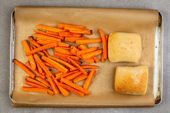 Die Brötchen 6–8Min. vor Ende der Backzeit zu den Karotten auf das Backblech legen und goldbraun aufbacken, die Karotten je nach Größe des Blechs etwas zur Seite schieben.