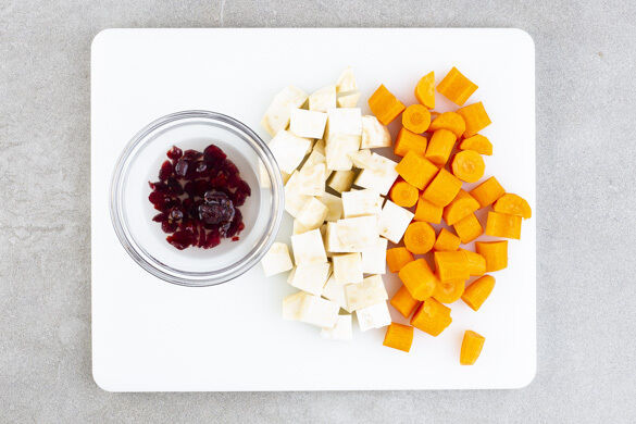 Den Backofen auf 240°C (220°C Umluft) vorheizen. Den Sellerie vierteln, schälen und in mundgerechte Würfel schneiden. Die Karotte ggf. schälen und in gleich große Würfel schneiden. Die Cranberrys in etwas warmem Wasser einweichen.