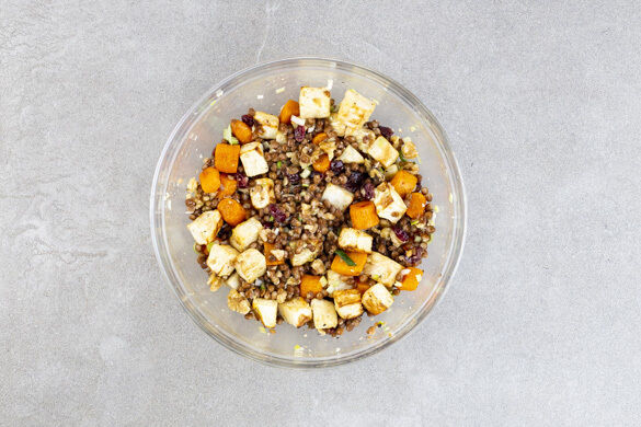 Den weißen Teil der Lauchzwiebel kleine Würfel, den grünen Teil in feine Ringe schneiden. Die Makrele von der Haut und evtl. vorhandenen Gräten befreien und in mundgerechte Stücke zerteilen. Die Linsen in einem Sieb mit kaltem Wasser abspülen und abtropfen lassen. Die Cranberrys abgießen.