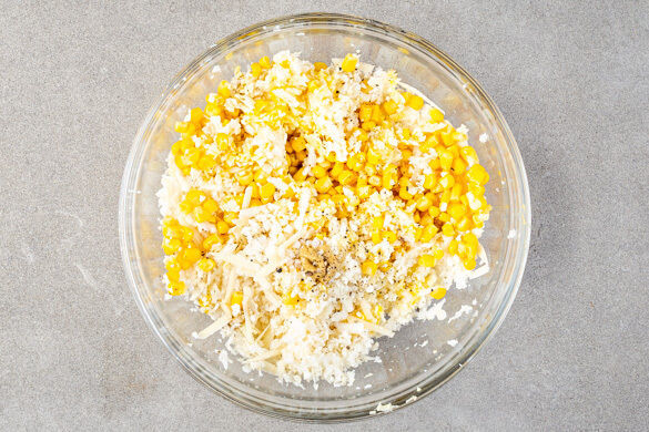 Den Blumenkohlreis mit dem Knoblauch, dem Mais, dem Käse, den Eiern sowie 2TL Senf, ½TL Salz und 1 kräftigen Prise Pfeffer vermengen.