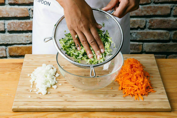 Den Backofen auf 220°C (200°C Umluft) vorheizen. Die Karotten ggf. schälen und mit einer Küchenreibe grob raspeln. Die Zucchini ebenfalls grob raspeln und in einem Sieb die überschüssige Flüssigkeit gut auspressen. Die Zwiebel schälen, halbieren und fein würfeln.