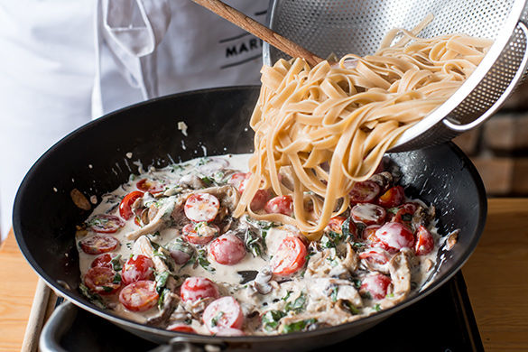 Einen großen Topf mit ausreichend gesalzenem Wasser zum Kochen bringen. Die Pasta darin ca. 8Min. bissfest gar kochen. Anschließend das Wasser abgießen und die Nudeln in einem Sieb abtropfen lassen.