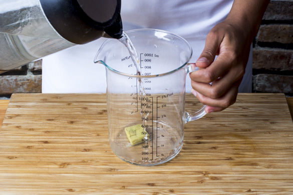 600ml Wasser im Wasserkocher aufkochen lassen und den Brühwürfel darin auflösen.