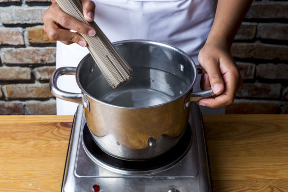 Sobald das Wasser kocht, die Sobanudeln hinzufügen und für ca. 4-5Min. kochen lassen, bis die Nudeln gar sind. Immer wieder umrühren, damit sie nicht aneinander festkleben. Abgießen und kalt abschrecken.