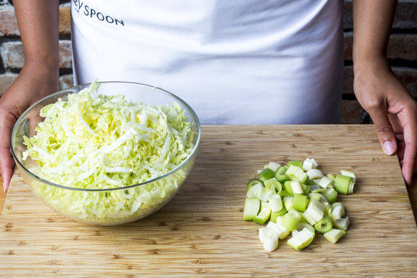 In einem mittleren Topf ausreichend gesalzenes Wasser für die Sobanudeln aufsetzen. Den Lauch längs halbieren, waschen und in schräge, ca.1cm dicke Streifen schneiden. Den Chinakohl ebenfalls längs halbieren und in feine Streifen schneiden.