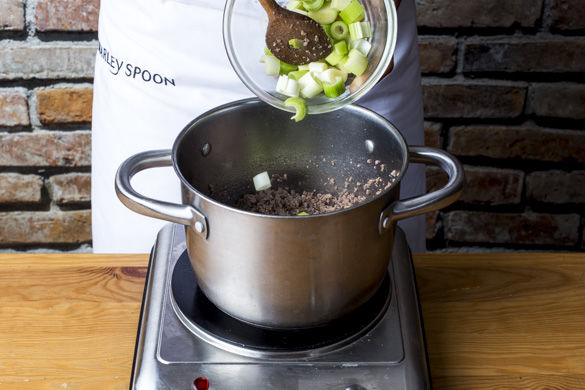 In einem großen Topf 1-2EL Pflanzenöl erhitzen und das Fleisch ca. 3-4Min. scharf anbraten, dann den Lauch hinzufügen und nochmal ca. 2-3Min. mitbraten.