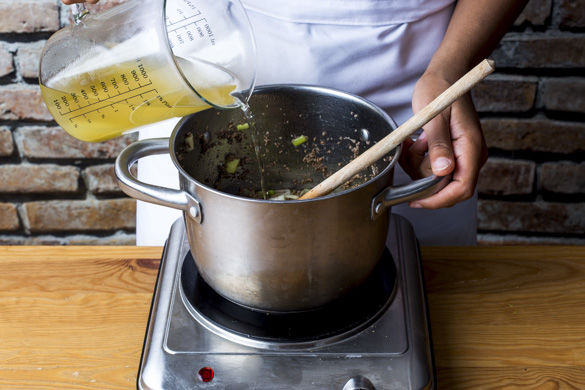 600ml Wasser im Wasserkocher aufkochen lassen und den Brühwürfel darin auflösen.