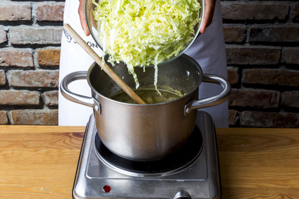 Zum Schluss die Nudeln und den Chinakohl unter die Suppe heben, eine Handvoll Kohl für die Garnitur zur Seite legen. Die Suppe gut mit dem Gewürz, Salz und Pfeffer abschmecken und mit Sesam und restlichem Kohl garniert servieren.