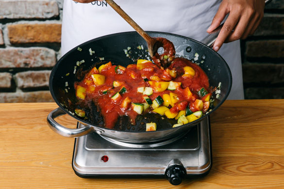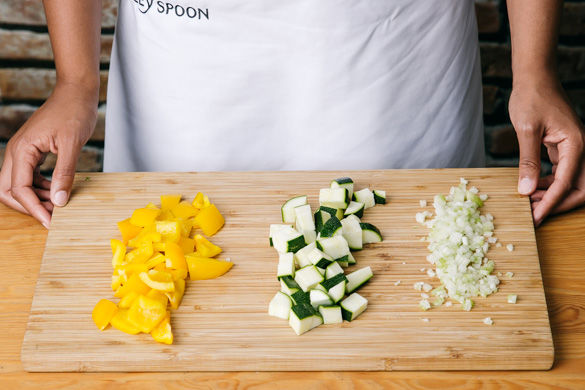 Den Grillbackofen auf 275°C vorheizen. Die Zwiebel schälen und fein würfeln. Die Zucchini längs halbieren und in ca. 1-2cm große Würfel schneiden. Die Paprika vom Kerngehäuse befreien und in ca. 1-2cm große Würfel schneiden.
