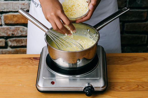 Inzwischen in einem mittleren Topf Milch, 300ml Wasser und 1TL Salz aufkochen, den Brühwürfel darin auflösen. Nach und nach die Polenta mit einem Schneebesen einrühren und bei mittlerer Hitze unter Rühren ca. 2Min. köcheln lassen. Eine Handvoll Käse für später aufheben, den restlichen Käse unterrühren und ca. 10-12Min. bei niedrigster Hitze quellen lassen.