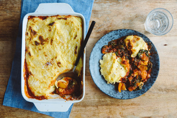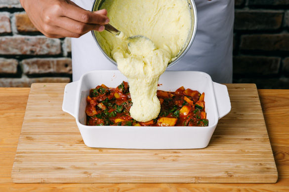Eine tiefe Auflaufform (ca. 31x21cm) mit der Gemüsesauce füllen. Die Polenta darüber verteilen, mit einem nassen Löffel glatt streichen und mit restlichem Käse bestreuen.