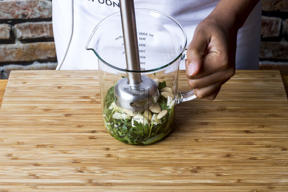 Währenddessen die Basilikumblätter von den Stängeln zupfen. Die Petersilie samt Stängeln grob hacken. Den Käse mit den Händen grob zerkrümeln. Den restlichen Knoblauch, mit den Kräutern, dem Käse, den Mandeln und 2–3EL Olivenöl mit einem Stabmixer in einem hohen Gefäß zu einem cremigen Pesto pürieren, dabei ggf. etwas Wasser hinzufügen.