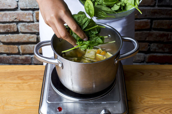 Nach Geschmack 1–2TL Zitronenabrieb unter das Gemüse heben, dann mit der Brühe ablöschen und die Ravioli hinzugeben. Die Hitze reduzieren und die Suppe ca. 5–6Min. köcheln lassen.