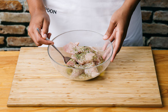 Die Hähnchenbrust mit etwas Küchenkrepp trocken tupfen und in ca. 1cm dünne Scheiben schneiden. 2–3EL Olivenöl, die 1/2 der Provencekräuter und das Fleisch gut vermengen und zum Marinieren beiseitestellen.