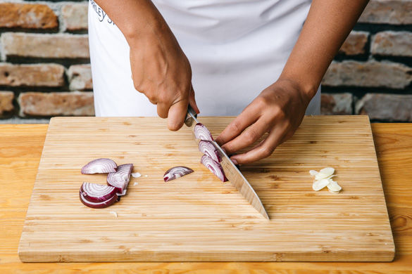 Den Knoblauch und die Zwiebel schälen. Den Knoblauch in feine Scheibchen schneiden, die Zwiebel halbieren und in Halbringe schneiden.