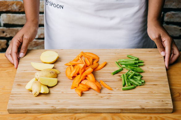 Die Kartoffeln nach Wunsch schälen und je nach Größe vierteln oder achteln. Die Karotten schälen, längs halbieren und schräg in ca. 0,5cm dünne Scheiben schneiden. Die Enden der Bohnen abschneiden und die Bohnen quer halbieren.