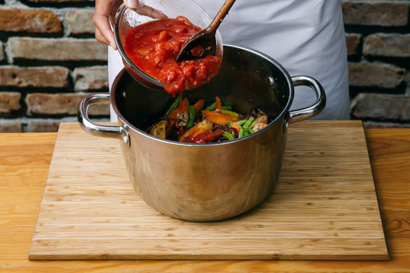 Das restliche Gemüse mit in den Topf geben, mit den gehackten Tomaten ablöschen und abgedeckt ca. 20–25Min. leicht köcheln lassen, bis die Kartoffeln und das Gemüse gar sind.